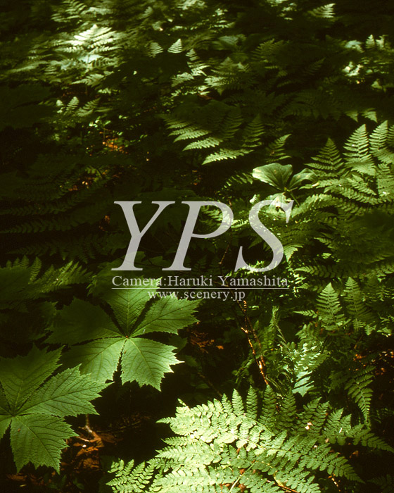針葉樹林帯の中はシダ植物が多い。木漏れ日が森の深さを感じさせる。