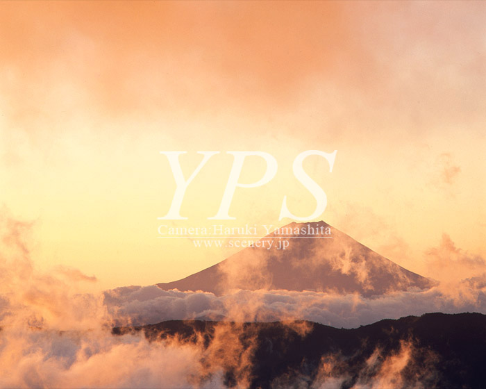 丸一日雨が降り続いた翌朝、赤く染まった雲の間から富士山が現れた。