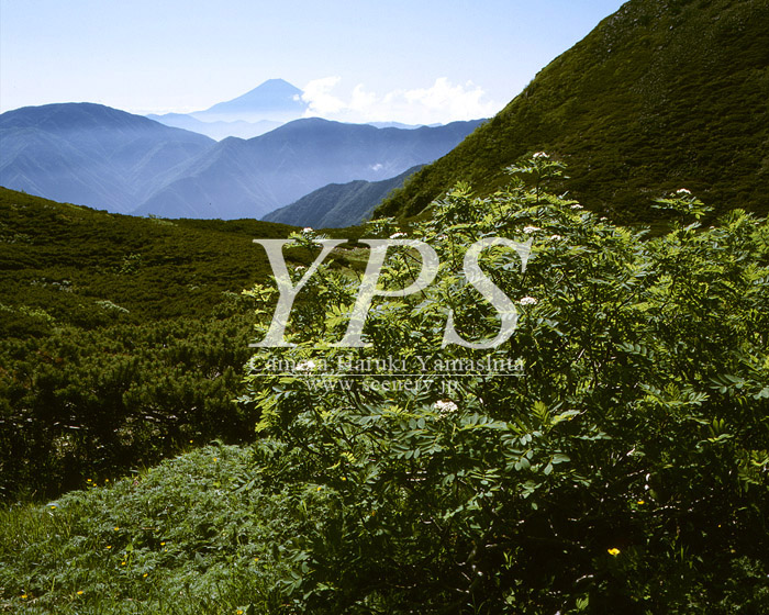 白い花を咲かせたウラジロナナカマド。夏の稜線の寸景。